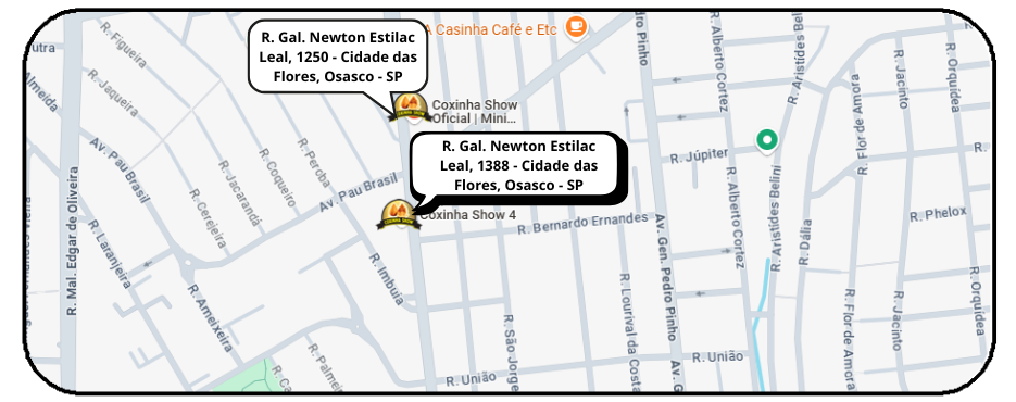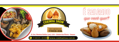 📍 A Coxinha Show em Osasco está aberta todos os dias, das 9h às 23h, com retirada no local ou delivery.